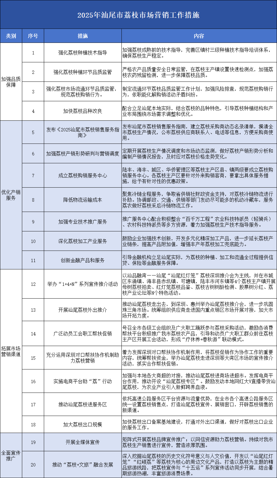 为进一步巩固前期成果,确保今年荔枝销售工作高效推进,市农业农村局还通报了《汕尾市2025年荔枝市场营销工作方案》(以下简称:《方案》),该方案推出20条具体举措。